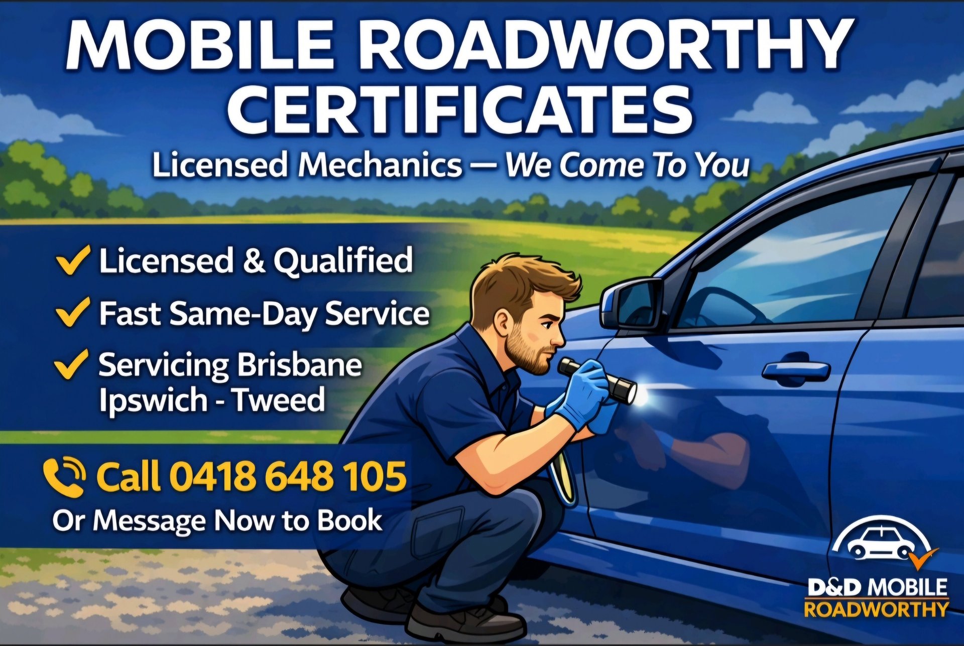 I needed a roadworthy certificate fast, and D&D Mobile RoadWorthy came right to my door. Friendly, quick, and passed first time!